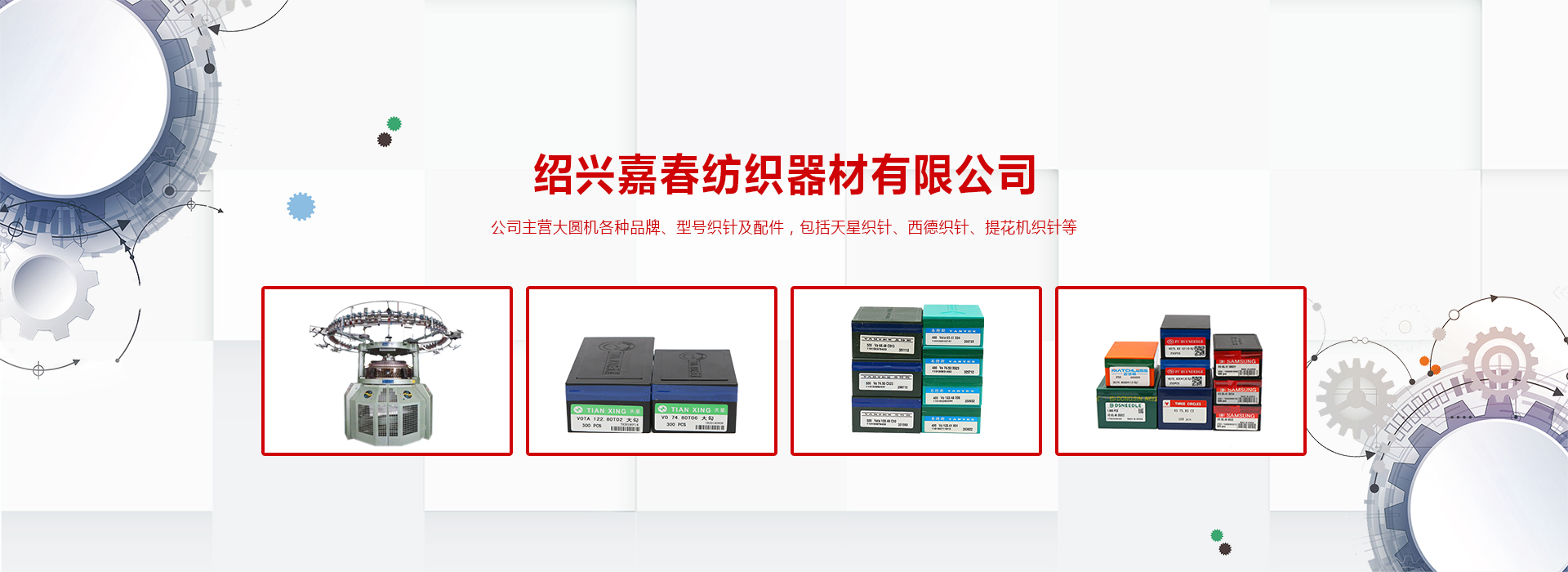 紹興嘉春紡織器材有限公司創(chuàng)辦于2008年,(原嘉智針配)座落于歷史悠久、風(fēng)景秀麗的紹興縣輕紡城(柯橋區(qū)),主營(yíng)大圓機(jī)各種品牌、型號(hào)織針及配件。主要產(chǎn)品有:煙臺(tái)天星織針、德國(guó)格羅茨針、易特斯針、德國(guó)克恩里伯斯生克片、臺(tái)灣生克片、祥云針織油、提花機(jī)專(zhuān)用針織油、各品牌齒帶、同步帶,定做各品牌、型號(hào)針筒、山角。